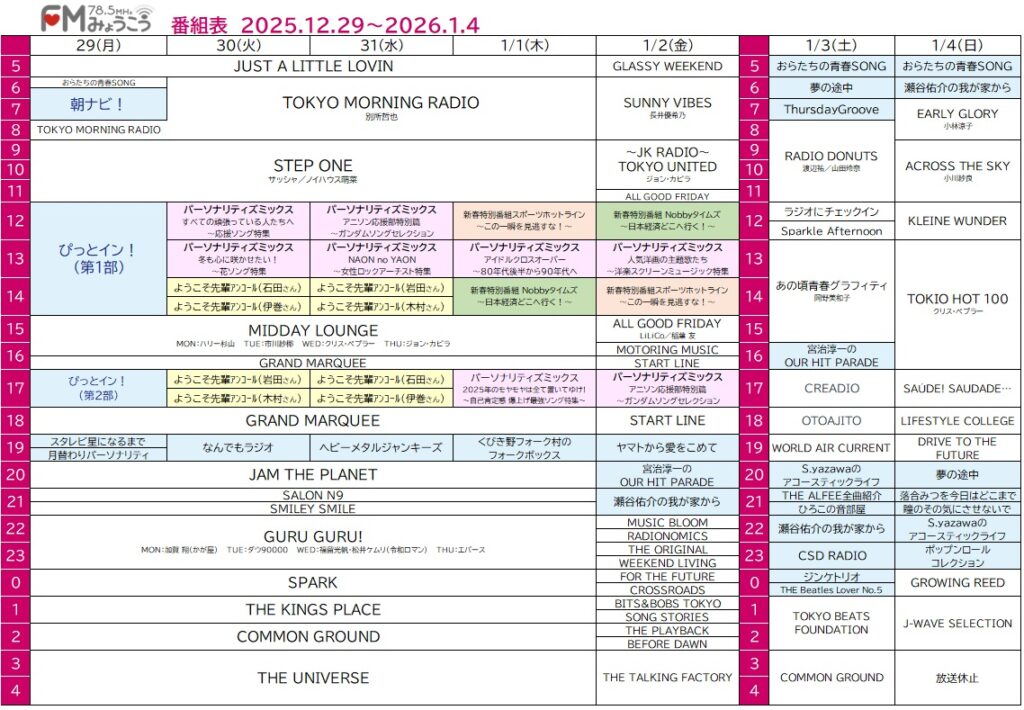 お知らせ 2025.12.28 年末年始(12/29~1/4)の番組表 FMみょうこうの年末年始(12/29~1/4)の番組表です。 特別番組もあります。お役立てください。 FMみょうこう年末年始番組表PDF